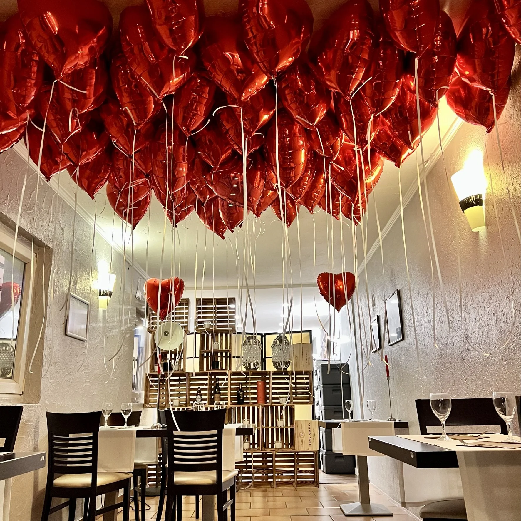 • Many red heart-shaped balloons fill the ceiling of a restaurant dining area, creating a festive atmosphere.