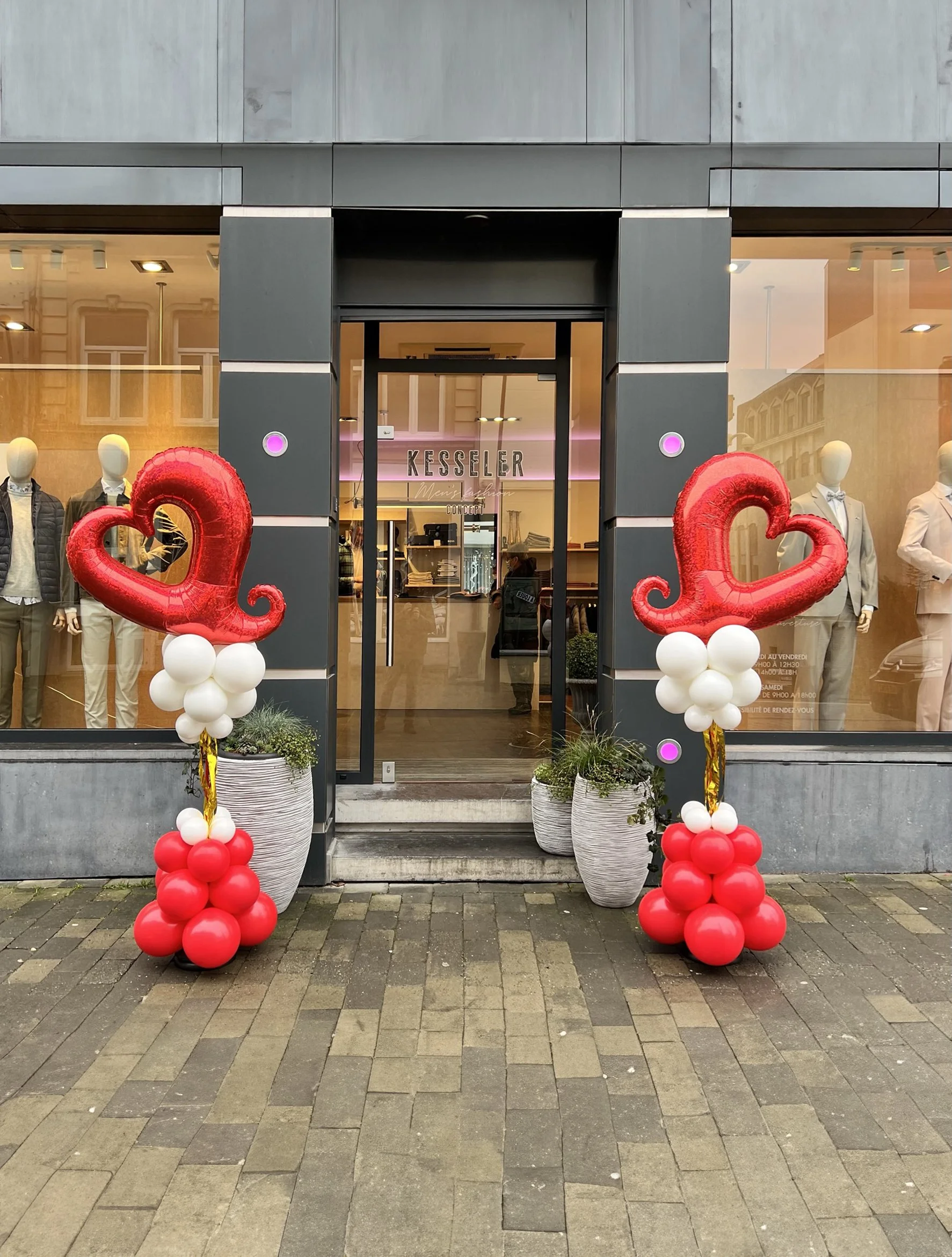 • Decorations with red heart-shaped balloons and white balloons outside a clothing store with mannequins dressed in suits inside.